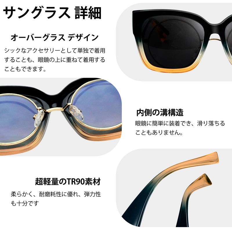 - TR90素材:フレームには高弾性プラスチックであるTR素材を使用。軽量でありながら柔軟性と耐衝撃性に優れ、スポーツやアクティブなシーンでも安心して使用可能。アウトドア好き、運転手さんにこのオーバーサングラスをお勧めします