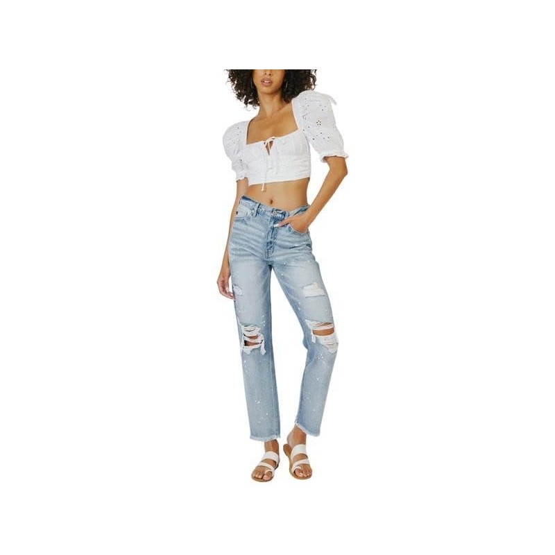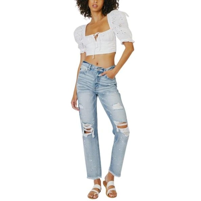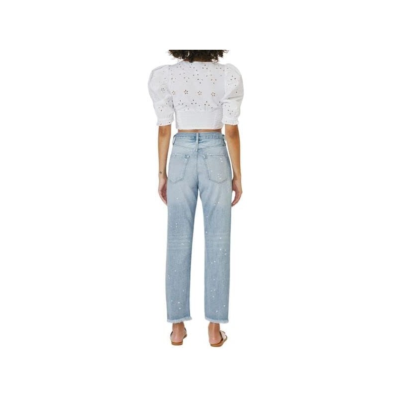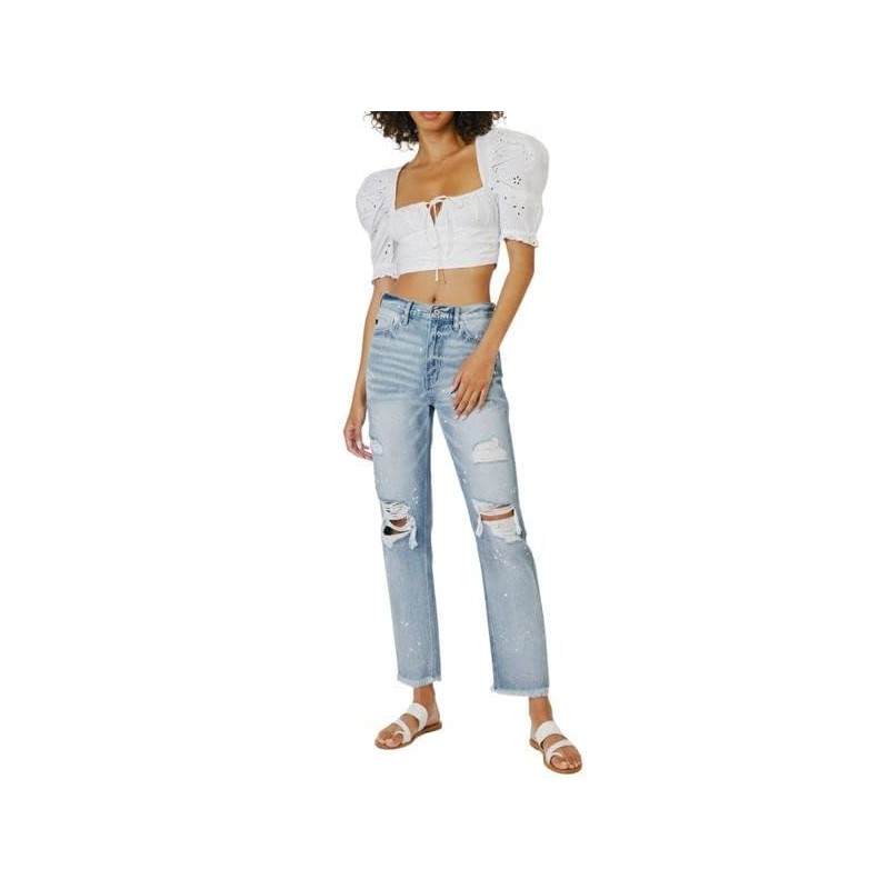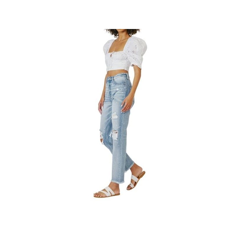 These Oceane High Rise Slim Straight Jeans are chic and trendy. This slim-fit comes with fading, whiskering, and medium distress. With unique detailing such as light paint splattering and frayed hem for a lived-in look. You can't go wrong with these beautiful medium shade blue jeans, fit for the everyday woman.