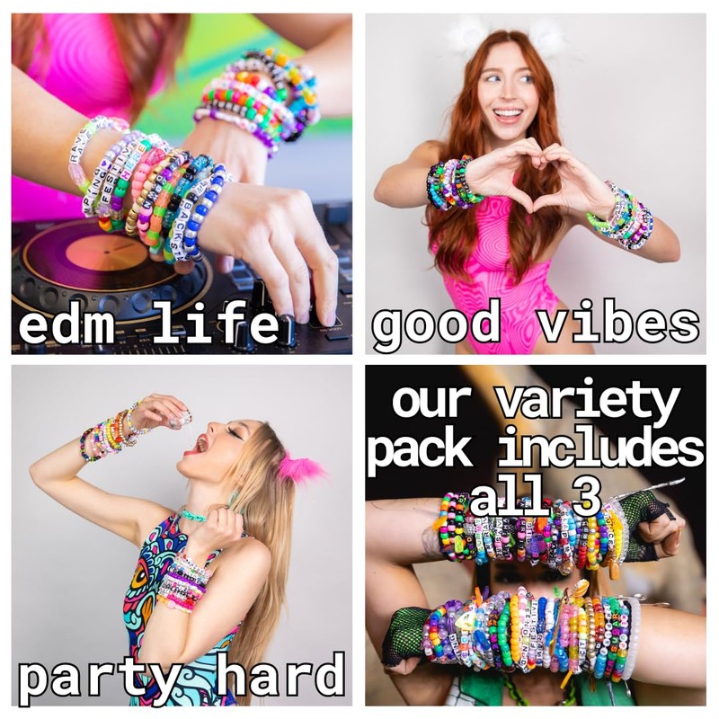 - AUTHENTIC & UNIQUE: true to EDM culture and rave tradition, each set of kandi is a surprise, and you never know exactly which words, phrases, charms, or colors you'll get. Different every time!!
