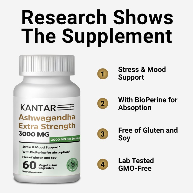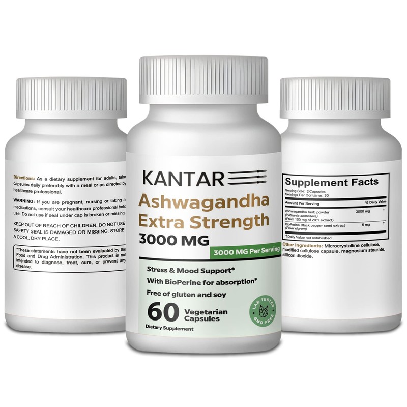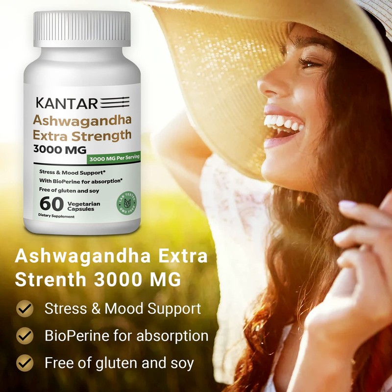 KANTAR Organic Ashwagandha Capsules 3000mg for Extra Strength, Stress & Mood, Focus and Energy Support Supplement Support with BioPerine for Absorption Free of Gluten and SOYA - 60 Capsules