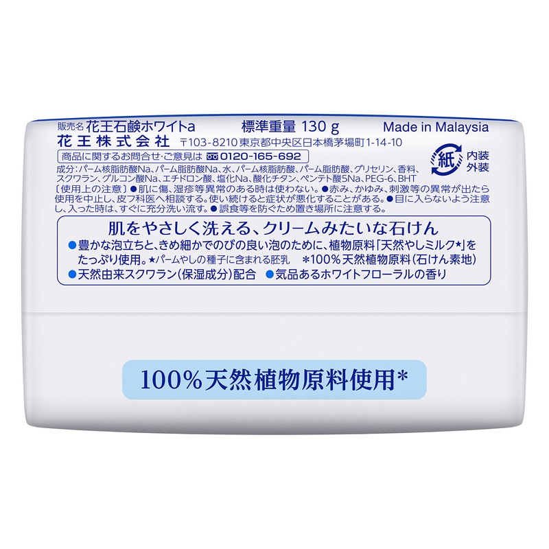 - All ingredients: Sodium palm nuclear fatty acid, sodium palm fatty acid, palm fatty acid, glycerin, fragrance, squalane, sodium gluconate, sodium chloride, sodium chloride, titanium oxide, 5 sodium pentatoacid, PEG-6, BHT