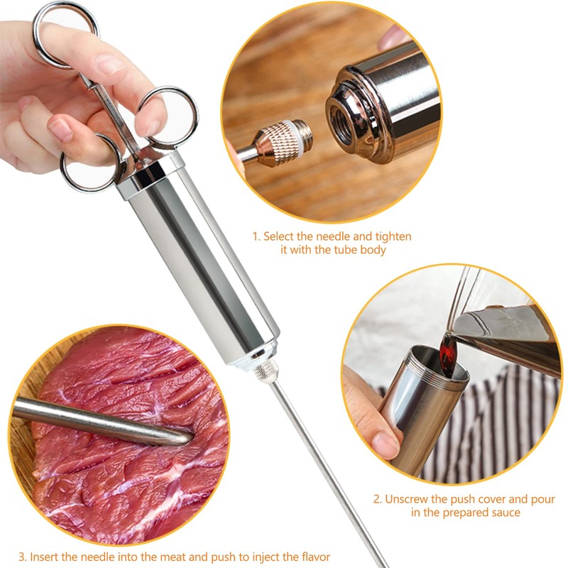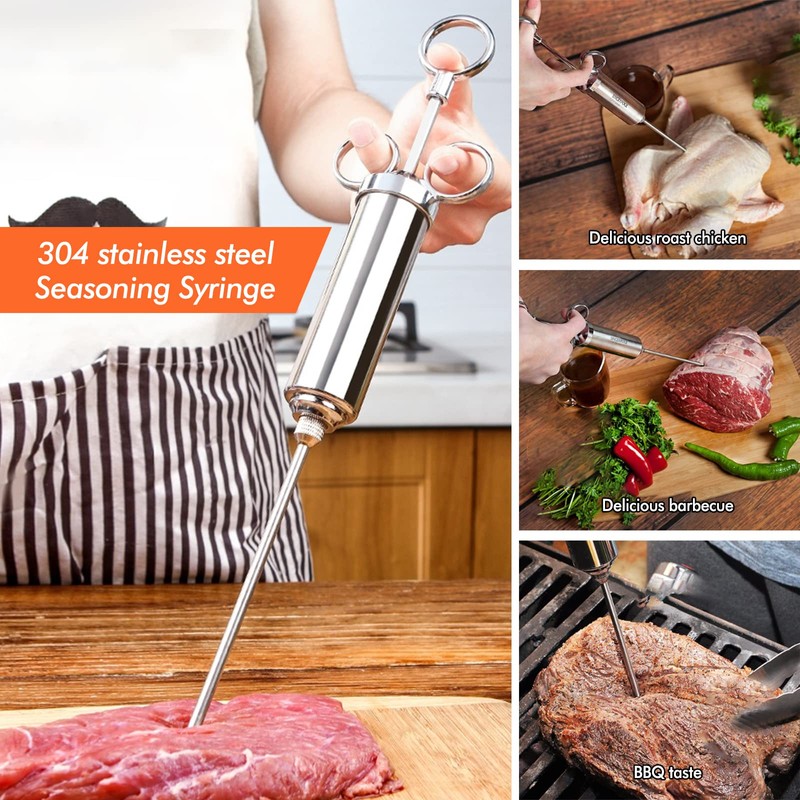 - ★You will receive: 1 baked syringe, 3 different needles, 3 cleaning brushes, 4 silicone seals, 1 x marinating brush. It is used for all types of meat and can easily make meat delicious.