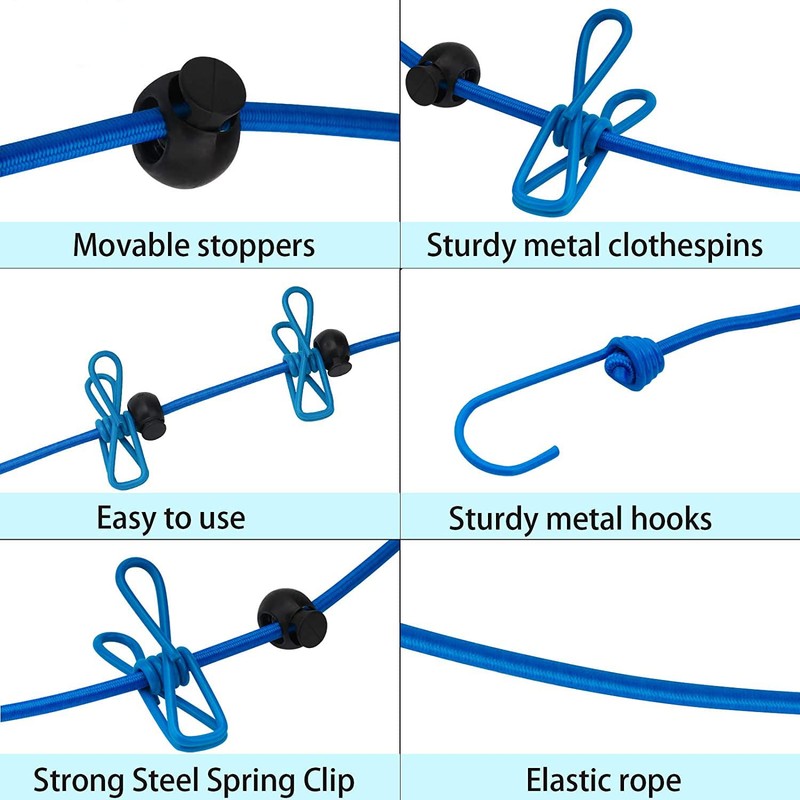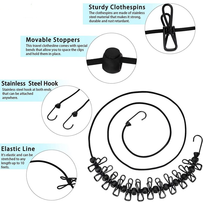 - ✅ Strong & Durable ✅ This Clothesline is made of multi-strand Elastic Rubber Band that owns good tenacity and durability ; it can be stretched up to 10 ~ 12 feet, strong & long enough to hang many clothes. This Portable Travel Laundry drying clothes Line conveniently dries your, socks, undergarments, tops,swimsuit, pants, bra, towel, briefs, scarf and other clothes.
