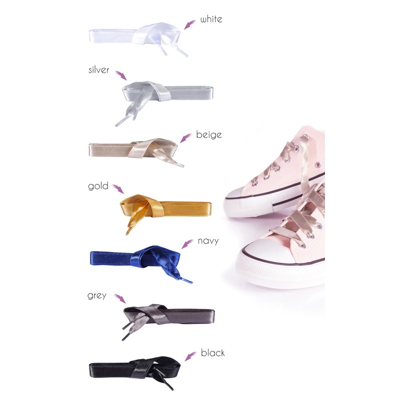 High-quality satin ribbon shoelaces for your trainers. Very stylish and modern laces.The satin ribbon laces are available in a range of sizes and lengths and are extremely strong and durable.