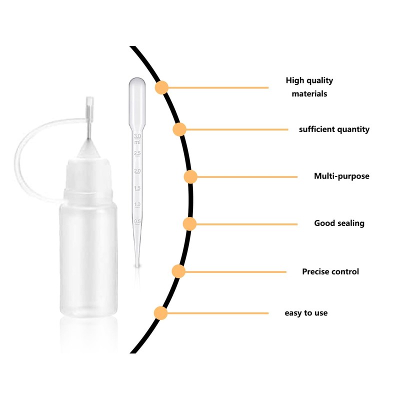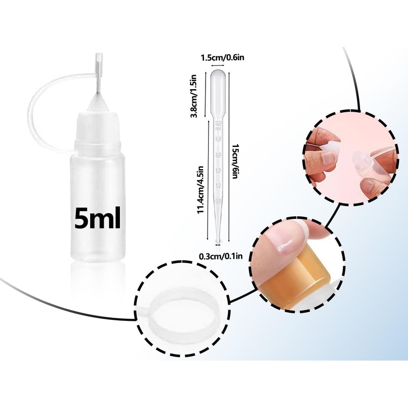 • PACKAGE INCLUDES 6 Needle Tip Applicator Bottles (5ml) + 2 3ml Dropper Dropper The bottle is small and lightweight and can be easily taken with you when going out.