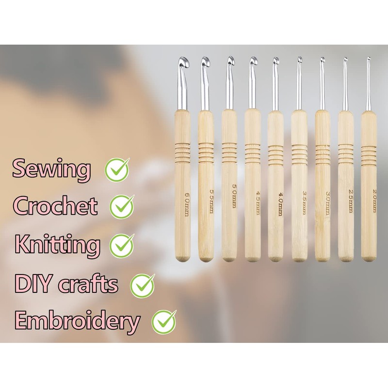 - Multiple Sizes This bamboo handle crochet hook has a total of 9 crochet hooks, the needle sizes are 2.0mm/2.5mm/3.0mm/3.5mm/4.0mm/4.5mm/5.0mm/5.5mm/6.0mm, suitable for various weaving needs, very practical. The size of each crochet head is clearly marked, so you can quickly choose the desired size.
