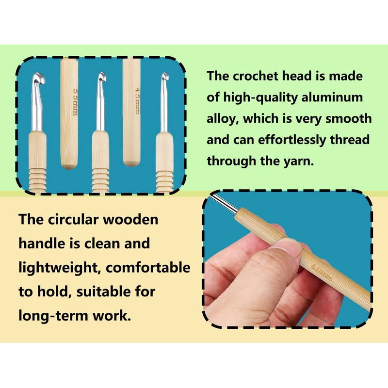 - HIGH QUALITY MATERIAL: This bamboo handle crochet hook is made of high quality bamboo and wood, which is comfortable to touch and excellent quality, but also very light and easy to carry. The crochet head is made of high quality metal material, which is very durable and not easy to rust or deform.
