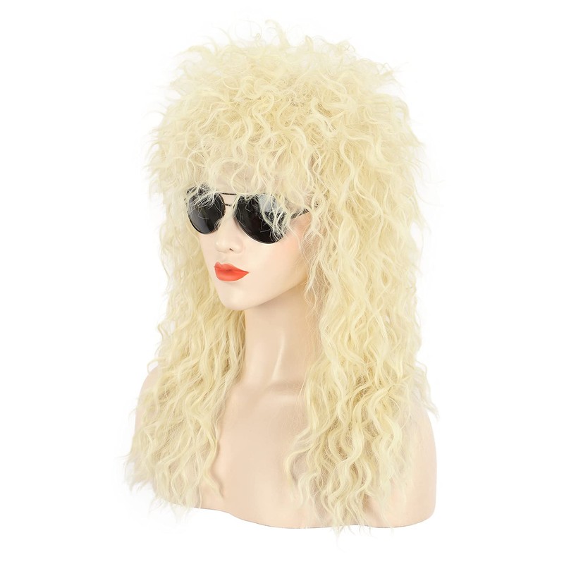 Karlery Adult Men Women Long Curly Blonde Wig 70s 80s Heavy Metal Rocker Mullet Costume Wig