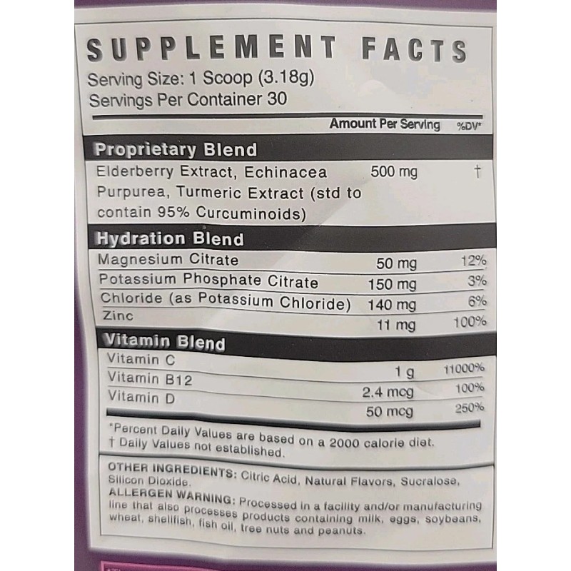 - Active Ingredients: Elderberry extract, echinacea purpurea, Tumeric extract 95% curcuminoids, magesium citrate, potasium chloride, Zinc, Vitamin C (Ascorbic Acid), Vitamin B12, Vitamin D