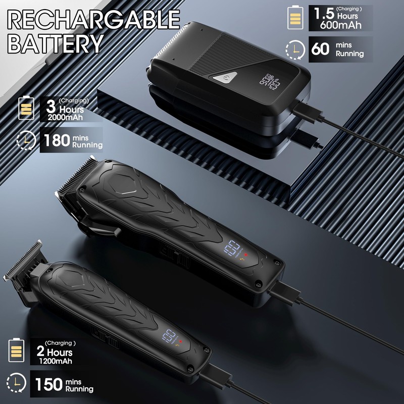 - LARGE CAPACITY BATTERY: Mens hair clippers have a built-in lithium-ion rechargeable battery, which allows you to utilize the trimmer all day and quickly recharge. Professional Clipper can operate wirelessly for up to minutes after hours of charging. T-Shaper Trimmer can operate wirelessly for up to minutes after hours of charging. Foil Shaver can operate wirelessly for up to minutes after . hours of charging. Convenient USB charging is available anytime, anywhere.