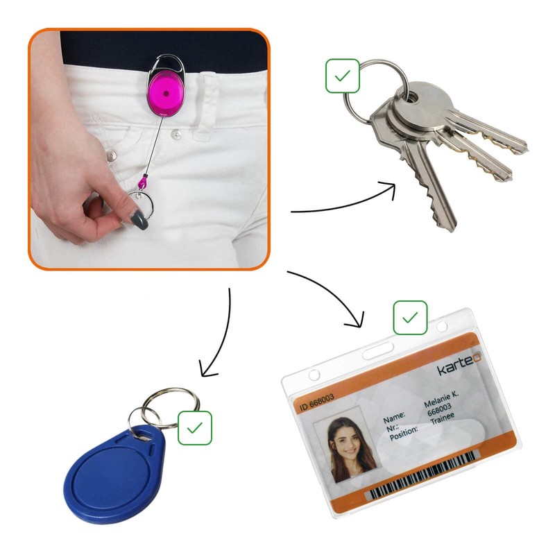 When worn with an ID yo-yo, it is very close to the body and still the card can be held on a reader. Simply pull the card holder and the yo-yo clip releases part of its cord. A yo-yo then pulls the cord back neatly and the card is close to the body again. Areas of application include personnel, sports events, show events or concert events.