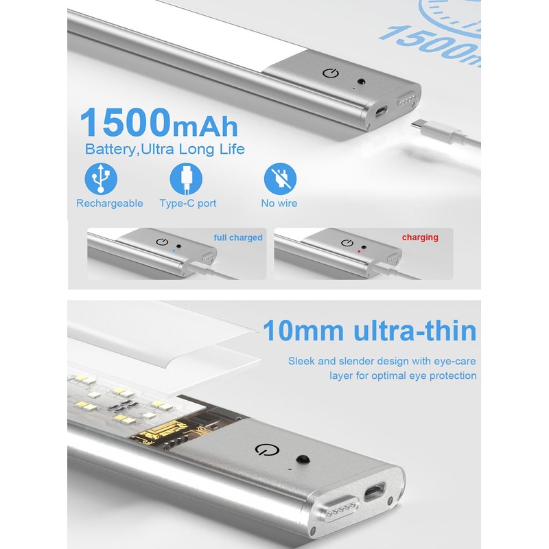 - Rechargeable & USB C Charging Our under cabinet lighting also adopted a more universal Type-C port for charging the built-in 1500mAh lithium battery, which about 2 hours to fully charge. and powered the closet light for 7 to 8 hours in 100% brightness. The under-counter light fixtures can be charged using any USB device, such as a computer, power bank, or adapter.