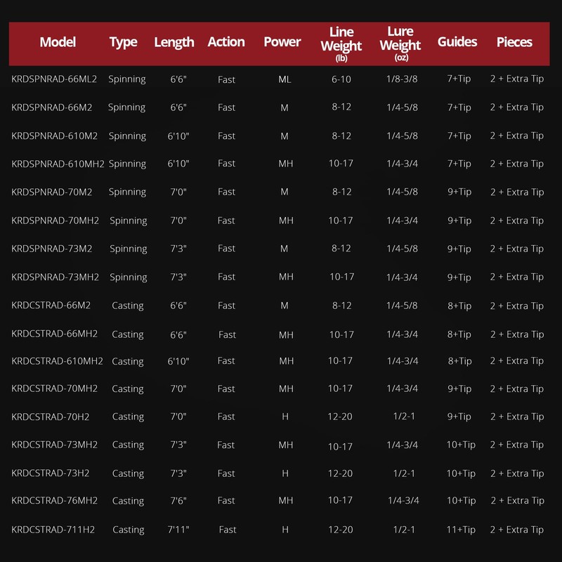 - 17 Different Rods: The KastKing Royale Advantage Twin Tip Fishing Rods range of 8 spinning and 9 casting rods. With such a diverse selection, you can be certain that these fishing rods will meet to your different needs.
