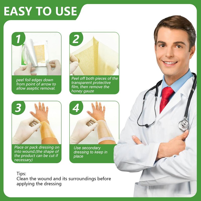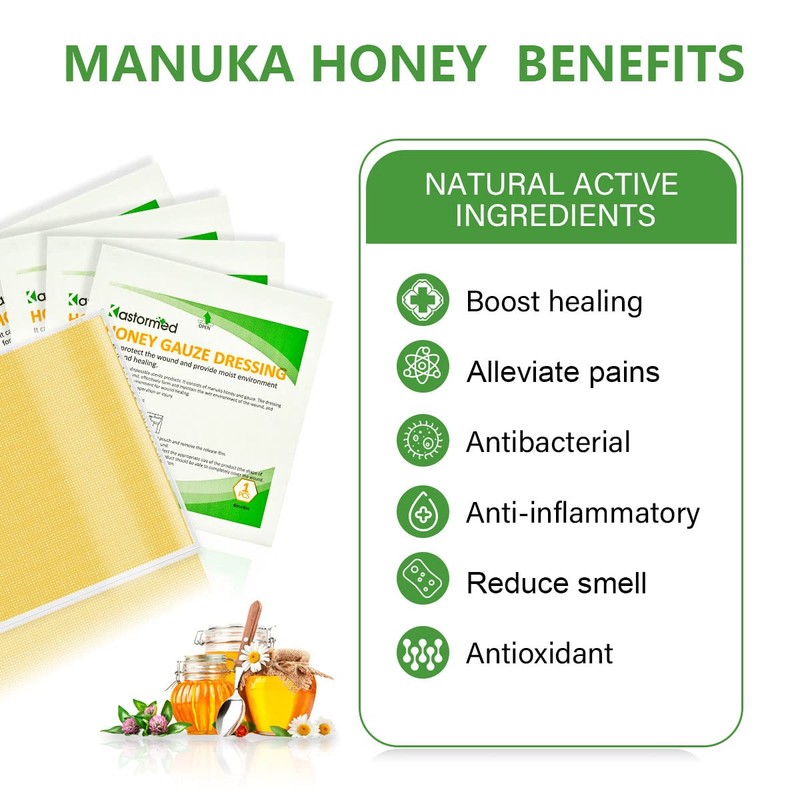 - Manuka Honey Gauze Dressing is wrapped individually to secure keeping sterile. Do not use it if the inner package is damaged or opened prior to use.