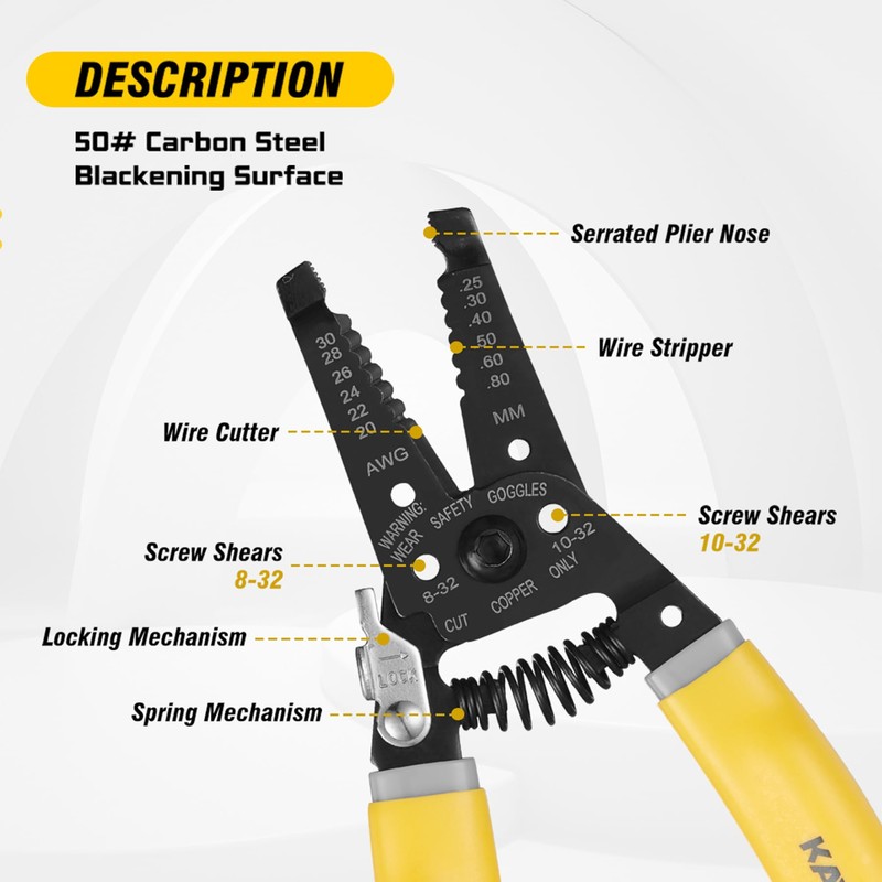 - Multi-functional Use: Wire stripper can complete the stripping, cutting, clamping, insulation terminal crimping, and even thread cutting functions