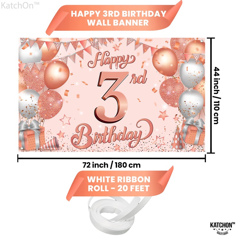 KatchOn, Rose Gold Happy 3rd Birthday Banner - Xtralarge, 72x44 Inch | Rose Gold 3rd Birthday Decorations for Girls | Rose Gold 3rd Birthday Backdrop for Girls | 3 Year Old Birthday Decorations Girl