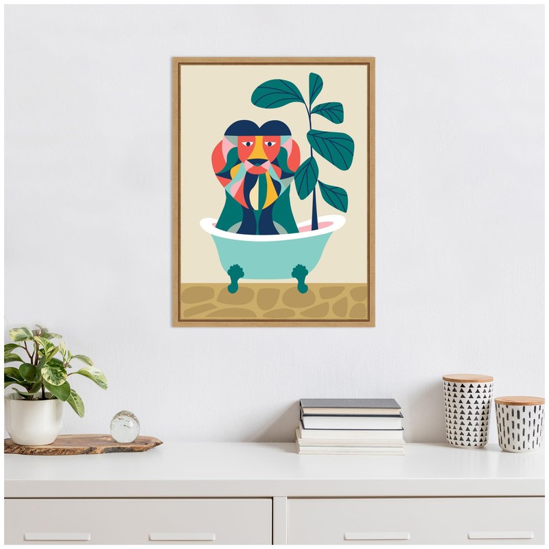 Kate and Laurel Mid Century Modern Lion in Bathtub Framed Canvas Wall Art by Rachel Lee 18 x 24 Sylvie Natural, Mid Century Modern, Animals, Bathroom, Kids Art for Wall Decor, Living Room, Bedroom