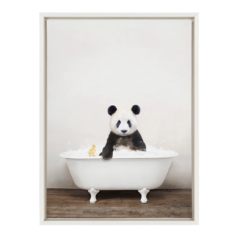 Kate and Laurel Sylvie Panda Waving in Rustic Bath Framed Canvas Wall Art by Amy Peterson Art Studio; 18x24 White; Modern Fun Decorative Bathtub Wall Art for Home Décor
