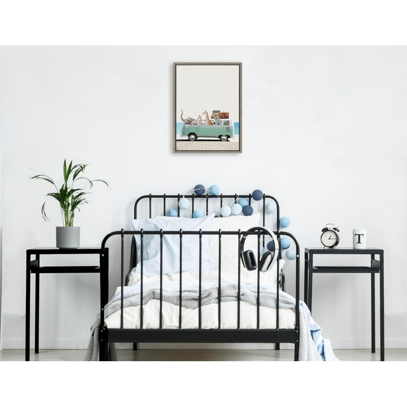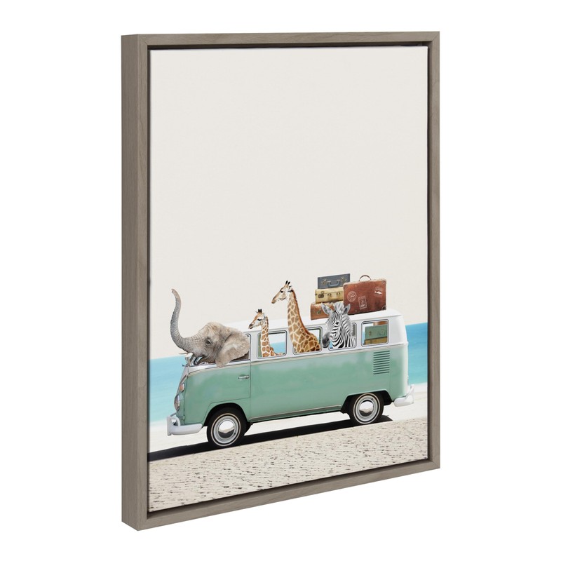 Kate and Laurel Sylvie Summer Animal Adventures Framed Canvas Wall Art by July Art Prints, 18x24 Gray, Zoo Animal Beach Van Wall Decor