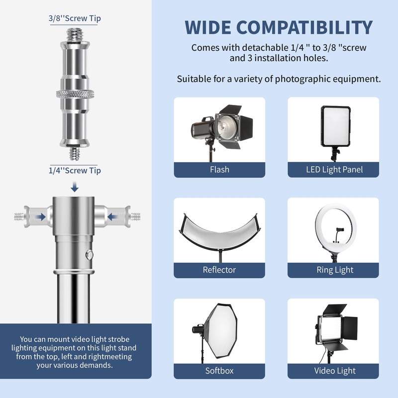 - Pro-Grade All-in-One Kit - Includes a detachable light stand tripod base, 1/4"♀-to-3/8"♂ adapter, and 3 tool-free swivel casters. Perfectly compatible with ring lights, boom arms, reflectors, and video light stand configurations. No extra purchases needed – shoot studio-quality content within minutes of unboxing.