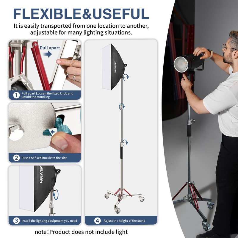 - Unshakable Stability, Effortless Mobility - Featuring 3 self-locking 360° casters and a heavy duty steel base, this light stand stays rock-solid during shoots yet glides seamlessly across studios or rugged outdoor terrain. The dual-braced tripod design eliminates wobble, even at full extension with heavy strobes or softboxes.
