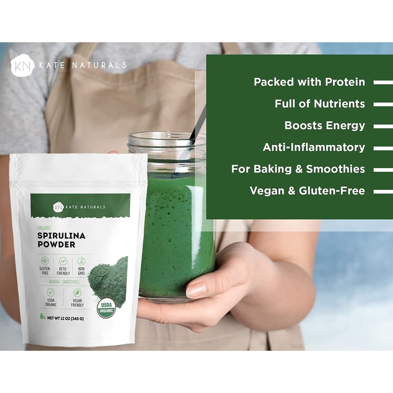 Kate Naturals Organic Spirulina Powder (12 oz) for Immune Support and Antioxidants USDA Certified. Natural. Non-GMO. Gluten-Free. Nutrient Dense Superfood Supplement