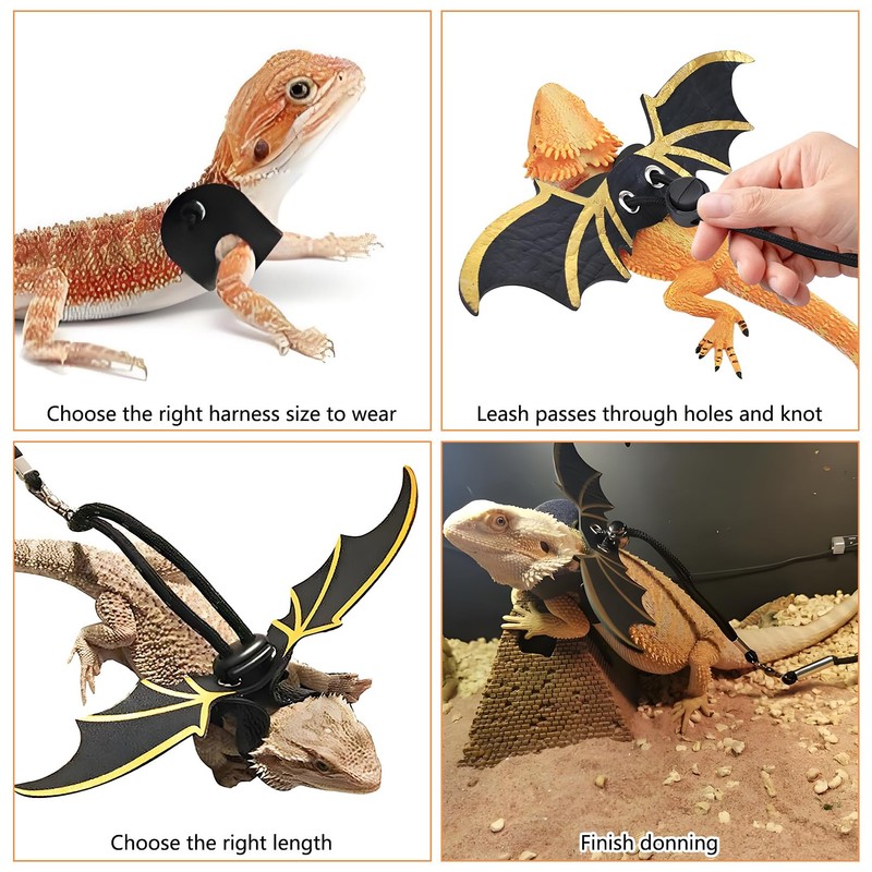 Bearded Dragon Adjustable Leash Bat Wings are made of soft leather and nylon rope, there are three different sizes: small, medium and large, there is an adjustable clip on the top of the rope, you can adjust it according to your pet's condition, suitable for pets with a chest circumference between 3 inches and 7 inches.