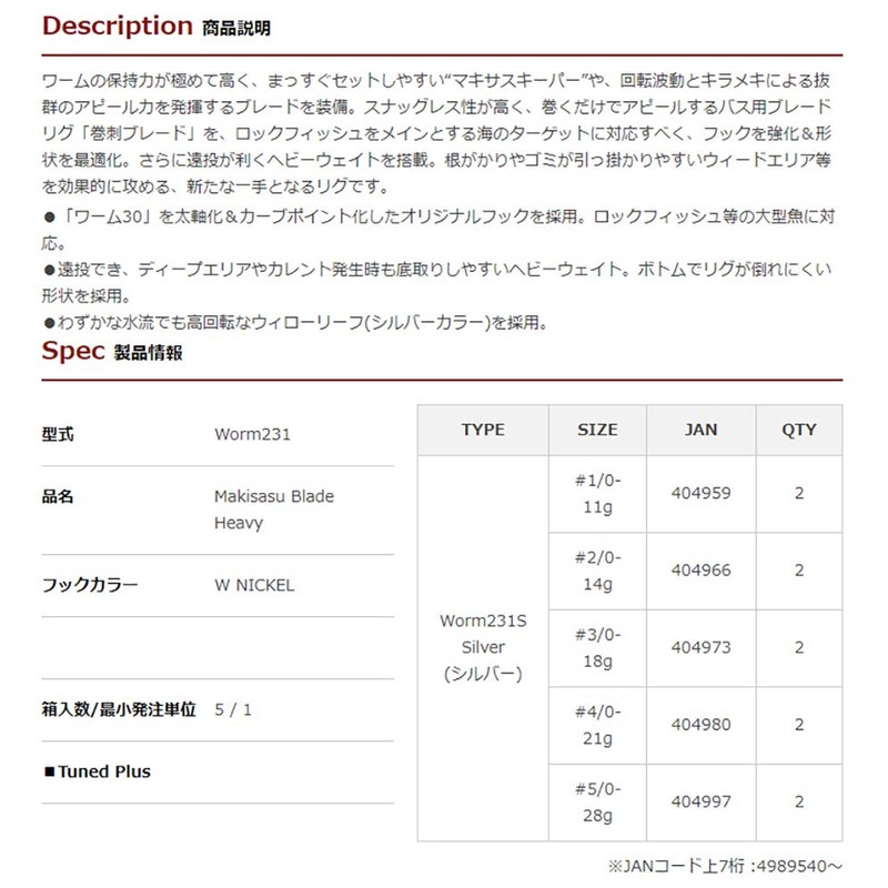 Katsuichi WORM231S Worm 231S Maxus Blade, Heavy #3/0-18g