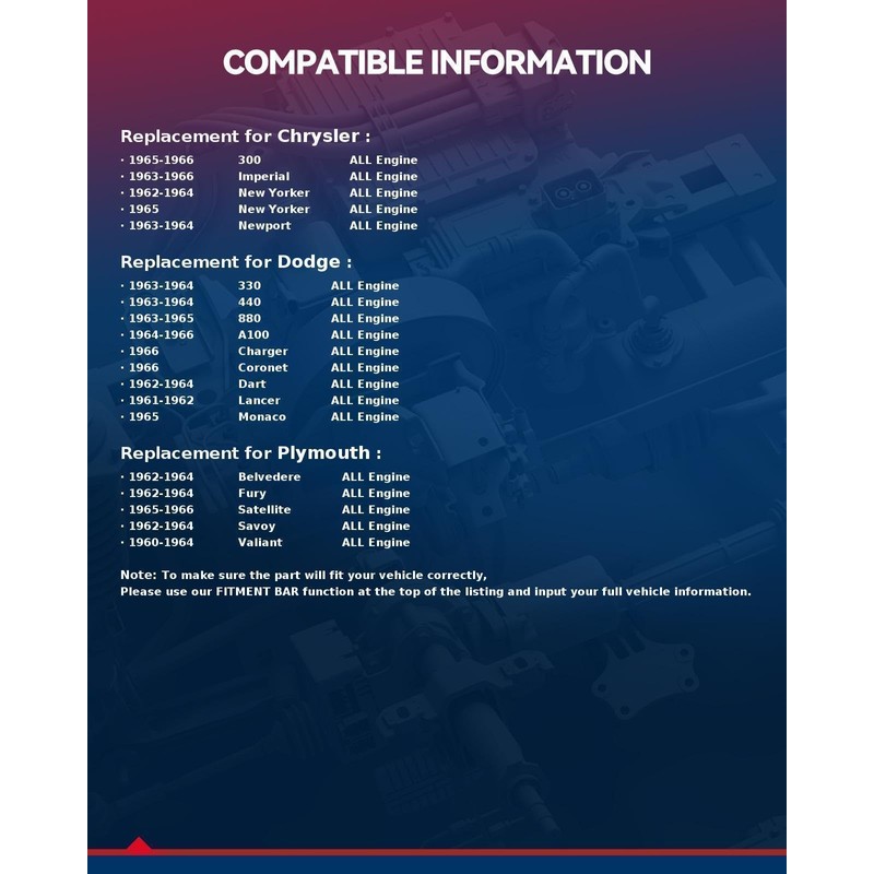 - ✔ DIRECT FIT REPLACEMENT – Precision-engineered to match OEM specifications for Chrysler 300 1965-1966, ensuring perfect compatibility and easy installation.