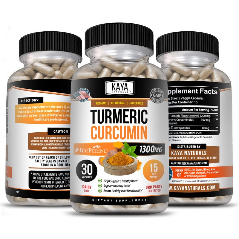 Kaya Naturals Turmeric Nature Made Bioperine, Joint Support with 95% Standardized Curcuminoids | Curcumin Nature Made - 1300mg Turmeric Capsules | Turmeric Curcumin - 30 Capsules