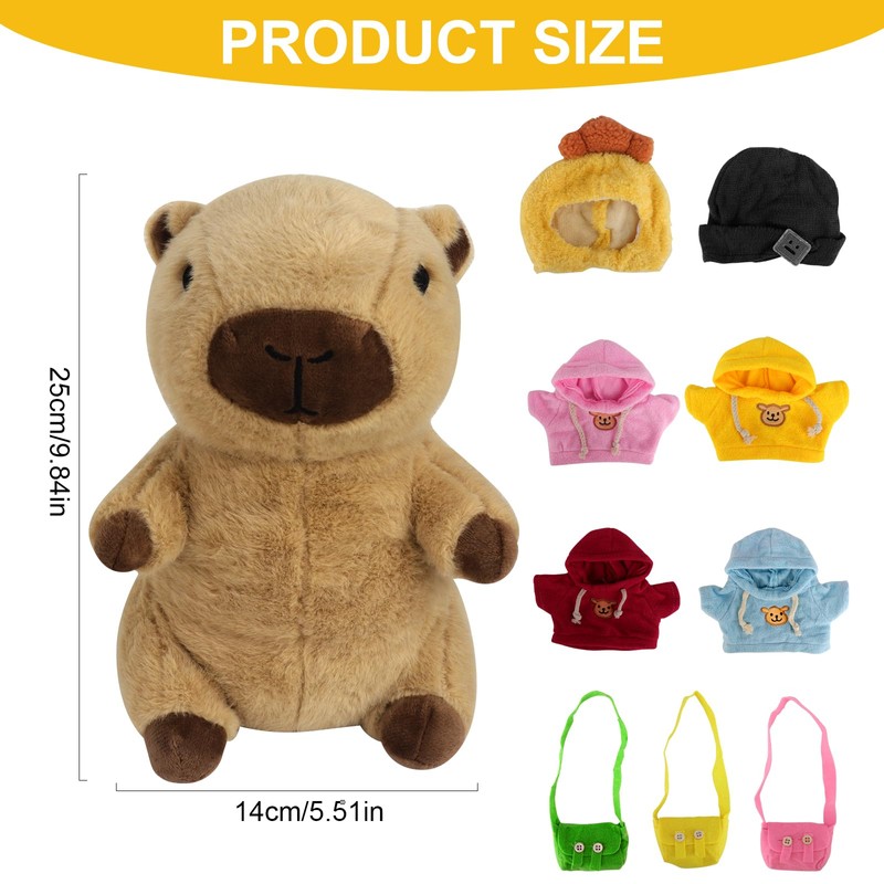 - 🐣【Capybara Plush Set】Our capybara plush toy comes with 9 pieces of clothing and accessories, including 4 items of clothing, 3 bags, 2 hat and 1 pufferfish plush animal, inspire kids to dress up, can match the capybara plush soft toy with different outfits and bags, multiple style combinations to exercise their imagination and creativity, suitable for kids pretend play.
