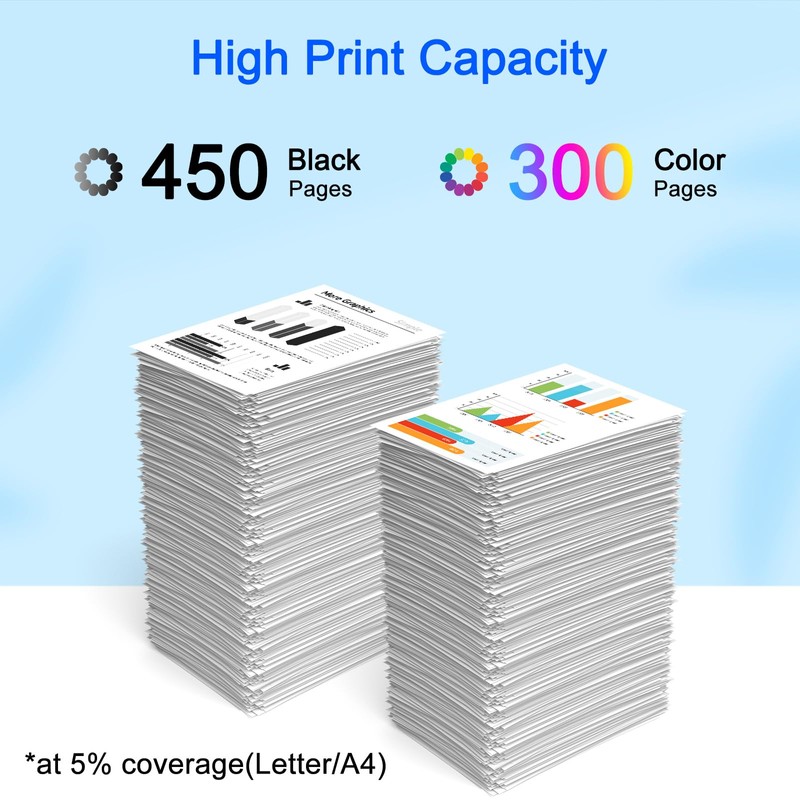 - Equal Quality, Lower Cost: Our ink cartridges deliver sharp text and vivid colors, matching OEM standards. Meanwhile, they cut printing costs by up to 50%. Black Cartridge: 450 pages* Color Cartridge: 300 pages* Fewer cartridge replacements enhance daily printing efficiency. (Page yields are based on ISO/IEC 24712 standards with 5% page coverage. Actual results may vary.)