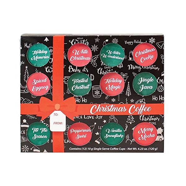- K CUP CHRISTMAS Gift Assortment of 12 single serve coffee cups, 1 of each flavor. Christmas flavors include: Christmas Cookie, Holiday Magic, Holiday Memories, Jingle Java, Merry Mocha Mint, Peppermint Swirl, Spiced Eggnog, Tis' the Season, Toasted Chestnut, Vanilla Snowflake, White Christmas and Winter Wonderland.