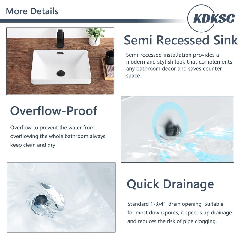• Premium Quality Material: This semi recessed sink is made from high-density glazed ceramic, durable and long-lasting. The smooth surface is easy to clean and maintain, ensuring its beauty for years to come