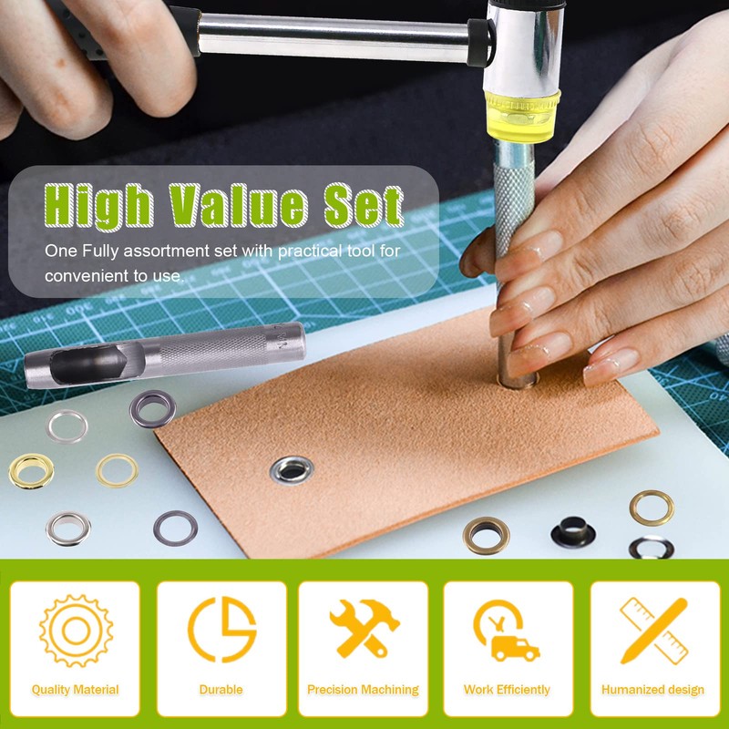 - 【Value Grommet Eyelet Tools Assortment Set】You will get 240pcs 5/32 inch silver/gold/black/bronze grommets eyelets (Each color is 60pcs) and 240pcs washers, 1pcs hole punch cutter, 1pcs grommets setting fastener tool and 1pcs double heads rubber hammer. The multiple eyelets with grommet installation setter will meet your the requirements of leather DIY projects, saving your your money and time.