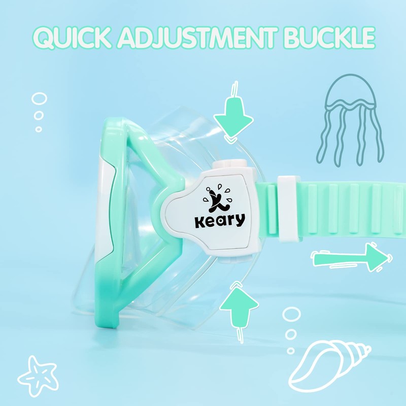- 🐋【Easy to Adjust for Kids】Keary water goggles fit a range of 5-15 years old children & Youth's faces. The straps of scuba diving mask can be easily adjusted by kids themselves in seconds - Just press masks' button buckle and pull the strap. The buckle holds the strap securely in place without creeping down in the water. TIPS TO AVOID THE LEAKAGE: Tighten the mask and you can feel that the silicone skirt is fully absorbed on your face.
