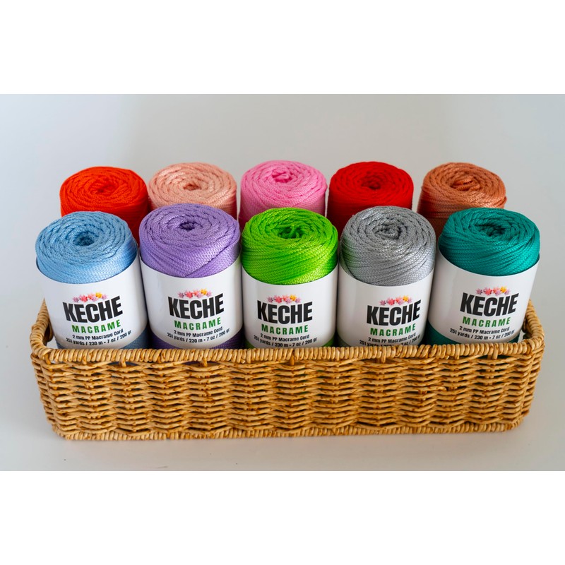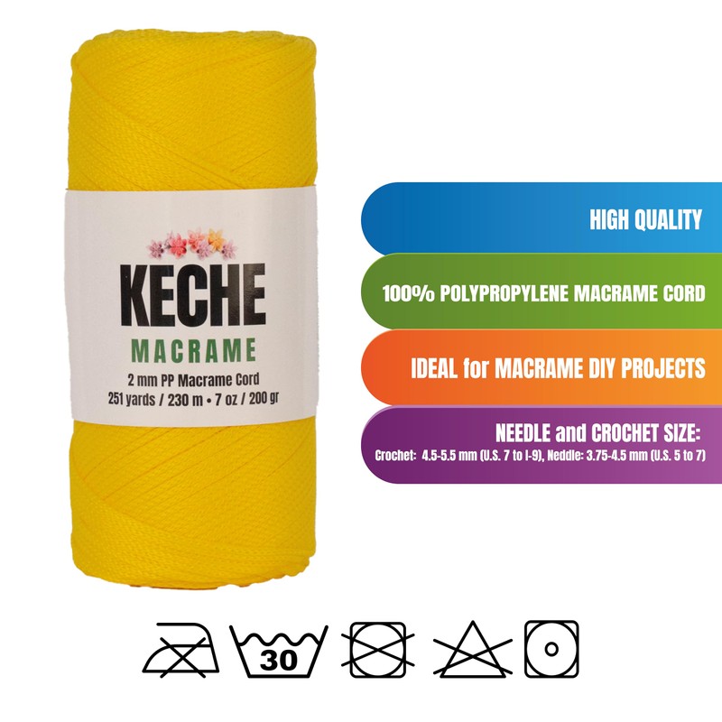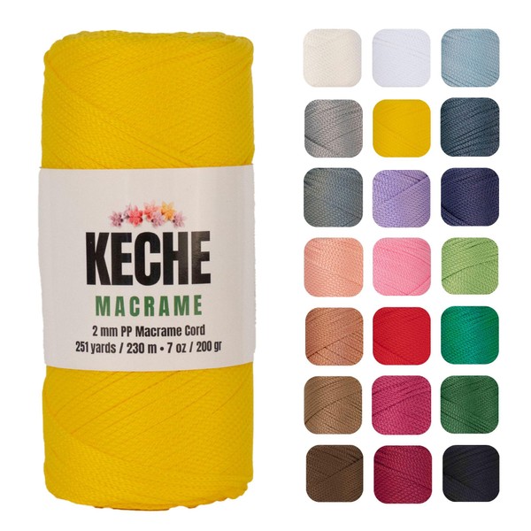 - Macrame Cord: Keche Macrame rope is made from high-quality 100% polypropylene. This macrame yarn is thick, soft, durable, and versatile. 7 oz (200 gr.) (Height and weight may vary by ±10%). It is a 2mm macrame cord, 754 ft-251 yards (230 meters) (may vary by ±10%).