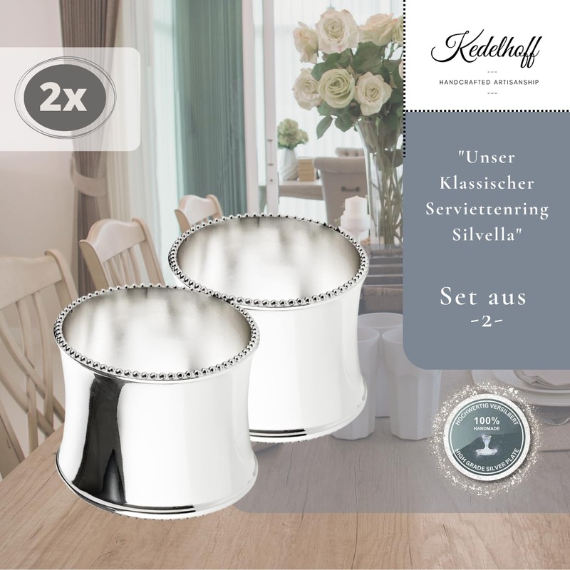Kedelhoff Silvella Napkin Rings, Set of 2, High-Quality Silver-Plated Handmade Napkin Rings, Round, Tarnish-Resistant and Diameter 5 cm
