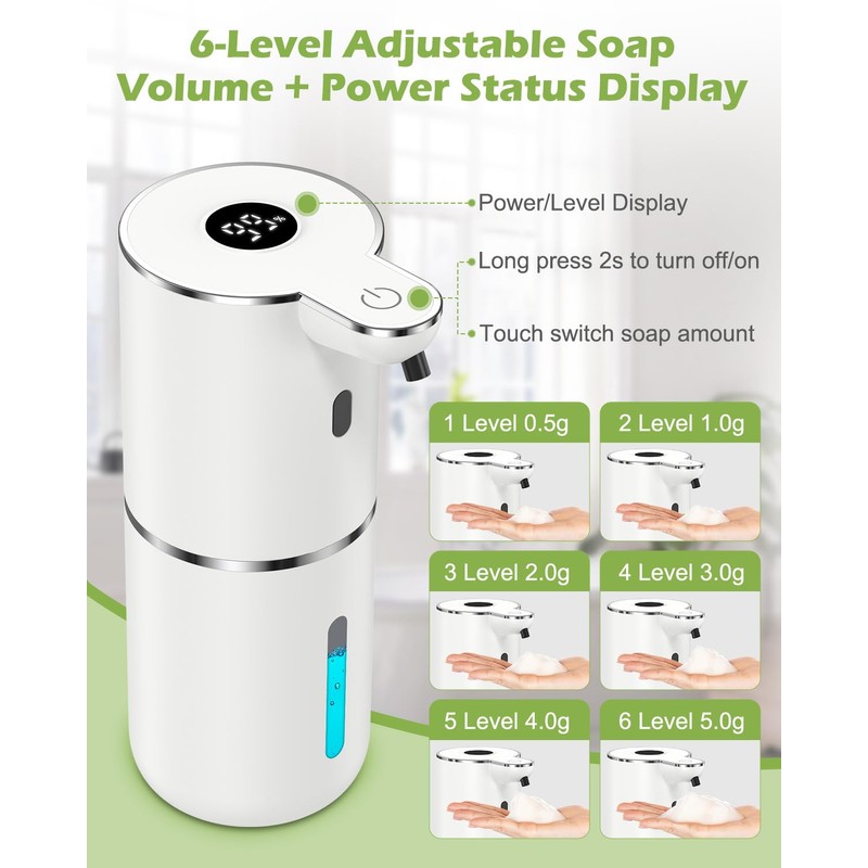 - Adjustable Foam Output: Features 6 customizable foam levels (0.5g/1.0g/2.0g/3.0g/4.0g/5.0g) and a transparent window to monitor soap levels, enabling easy refills