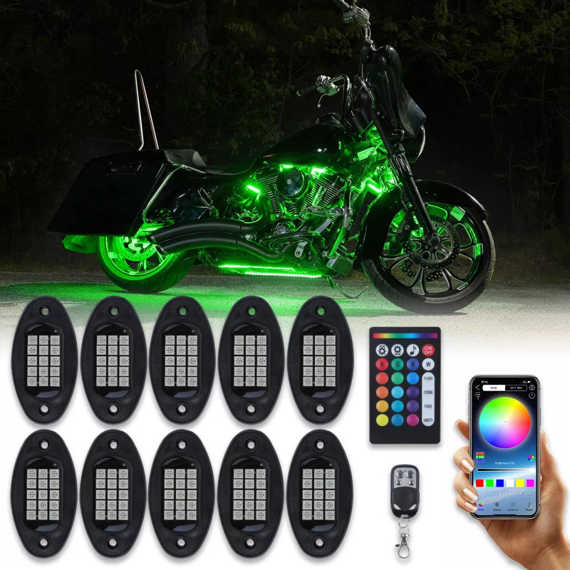 KEEPDSGN 10 Pods Motorcycle LED Rock Light RGB Neon Underglow Kit For Harley Honda Yamaha
