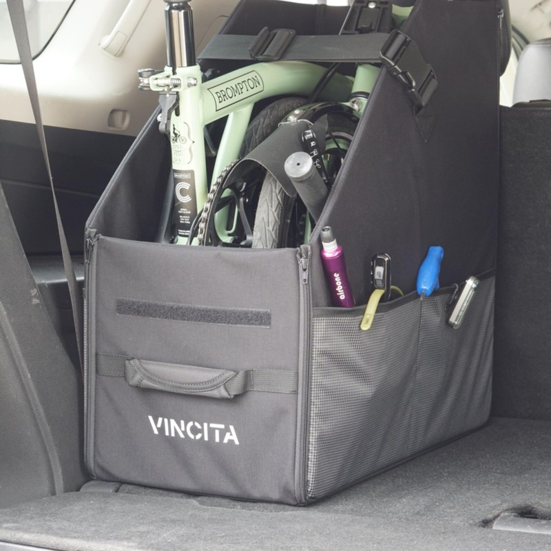 - Features a built-in, durable handle that withstands the weight of any foldable bike. It allows for vertical placement to save storage space in smaller vehicles. There is an integrated cover to prevent bike theft when the car is unattended.