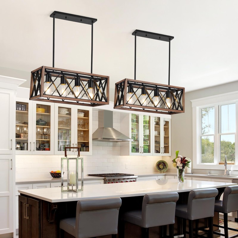 - Rustic Industrial Design:Crafted with a classic rectangle metal frame featuring imitation wood grain colour, this kitchen island pendant light combines rugged iron elements with rustic finishes for a modern farmhouse-industrial hybrid aesthetic.