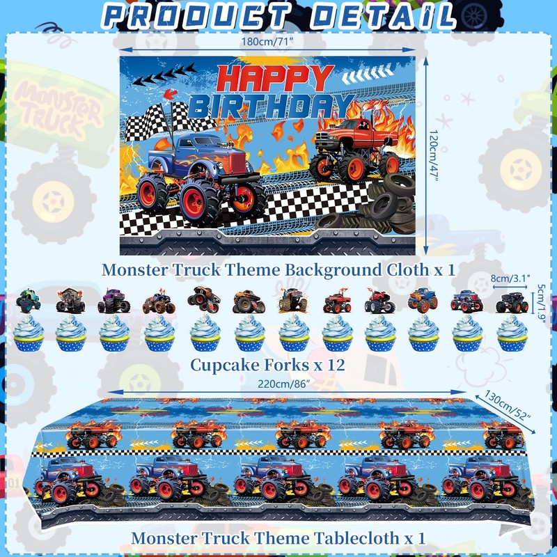 KEFAN Monster Truck Birthday Party Supplies, Monster Truck Party Decorations Set including Backdrop, Plates, Cups, Napkins, Tablecloth, Balloons for Children birthday Party (Background)