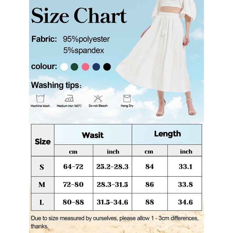 • Washing/size: The long women's summer skirt is easy to clean, machine or hand washable, do not bleach, tumble dry or hang to dry. For a perfect fit, please read the size chart in the product images before purchasing.