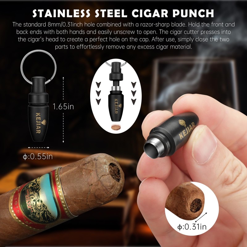 - With Practical Cigar Accessories: KEJIAR travel cigar case is specially designed to integrate cigar accessories into its lining seamlessly. It features a SHARP V CUT CIGAR CUTTER with a 0.7'' diameter and a STRAIGHT CUT CIGAR CUTTER with a 0.94'' diameter, catering to different cigar cutting preferences, the cutter ensure accurate and quick cuts without damaging your cigars. The CIGAR PUNCH has a 0.31'' diameter providing a clean and neat cut everytime, adds extra convenience for cigar lovers