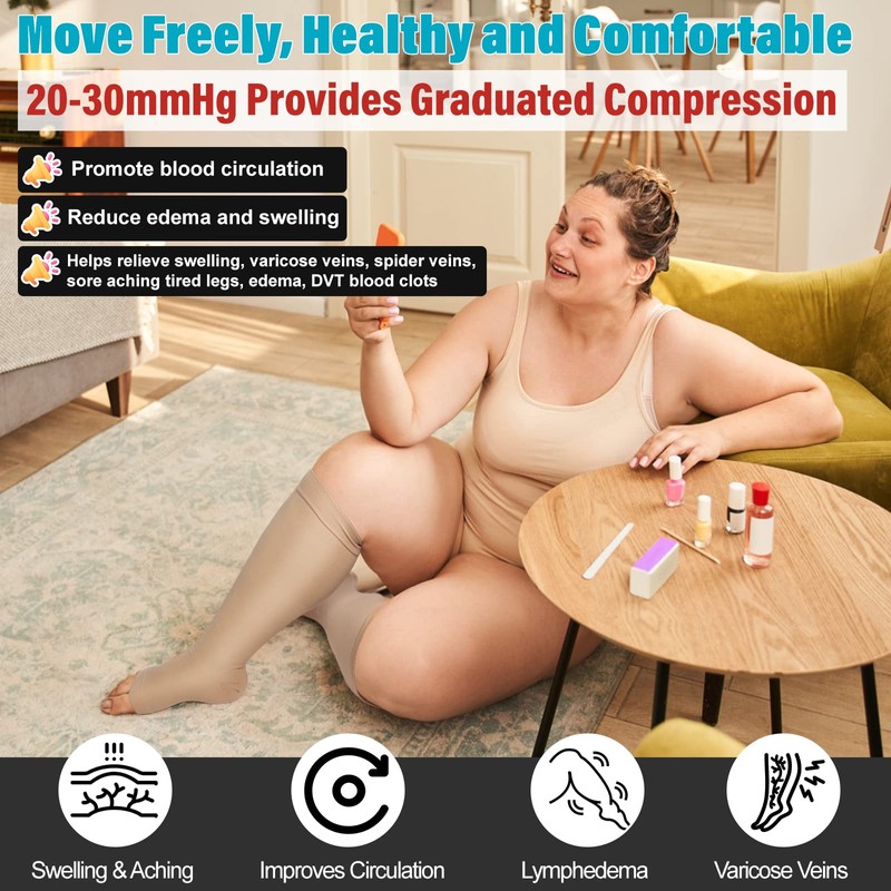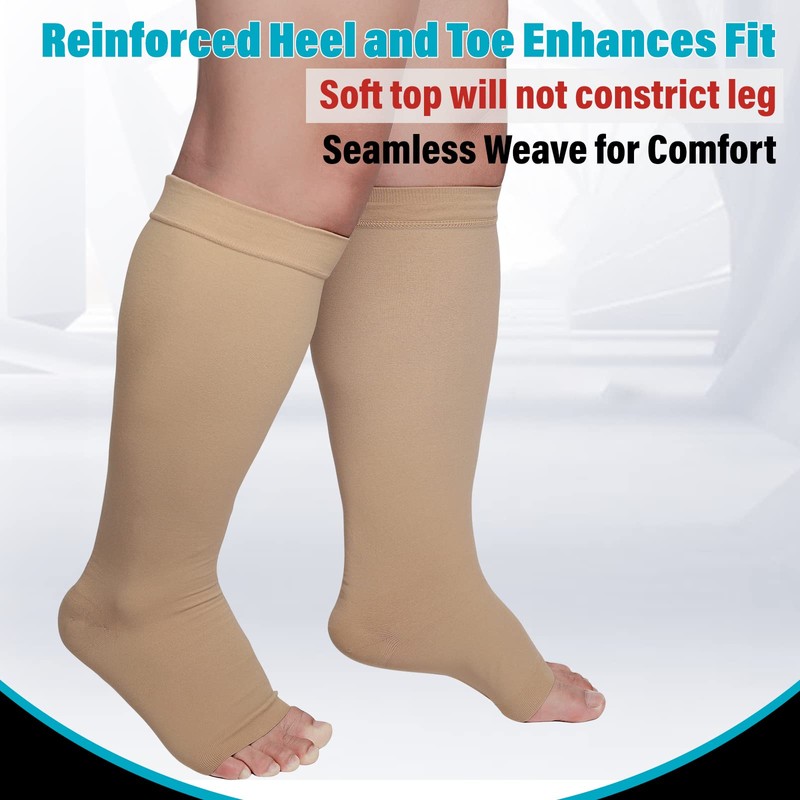 KEKING® Extra Wide Calf Compression Socks for Men & Women, 20-30 mmHg Compression Stockings Open Toe - Plus Size Knee High Support Hose for Varicose Veins, Pain Relief, Swelling, Beige 5XL