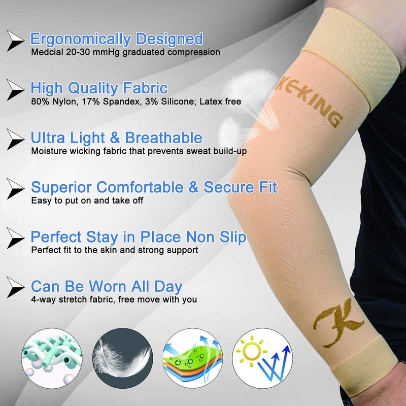 - ✅【Therapeutic Compression】 - KEKING will bring you well-designed medical compression arm sleeve that provides 20-30 mmHg graduated compression, use for tendonitis elbow brace or pain in bicep, elbow or forearm, arthritis, bursitis, osteoporosis and more; Rehabilitation, physical therapy; Ideal for wearing post surgery and post injury for muscle and joint support to reduce swelling, relieving symptoms of joint pain, keep joint stability; You will notice the change if you wear them a few hours