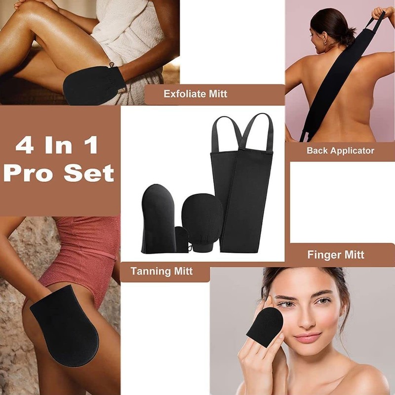 - 4 in 1 Self Tanner Mitt Pro-Kit --- No more to seek help from others now, you can achieve real self-tan with our 4 in 1 tanning mitt applicator kit! It includes 1x tanning glove, 1x mini face mitt, 1x back lotion applicator, and 1x exfoliating glove, which covers all you need. All the self tanning mitt - various styles and sizes, whether applying the delicate area, body, or your back, achieve a true full self-tan and natural-looking effect.