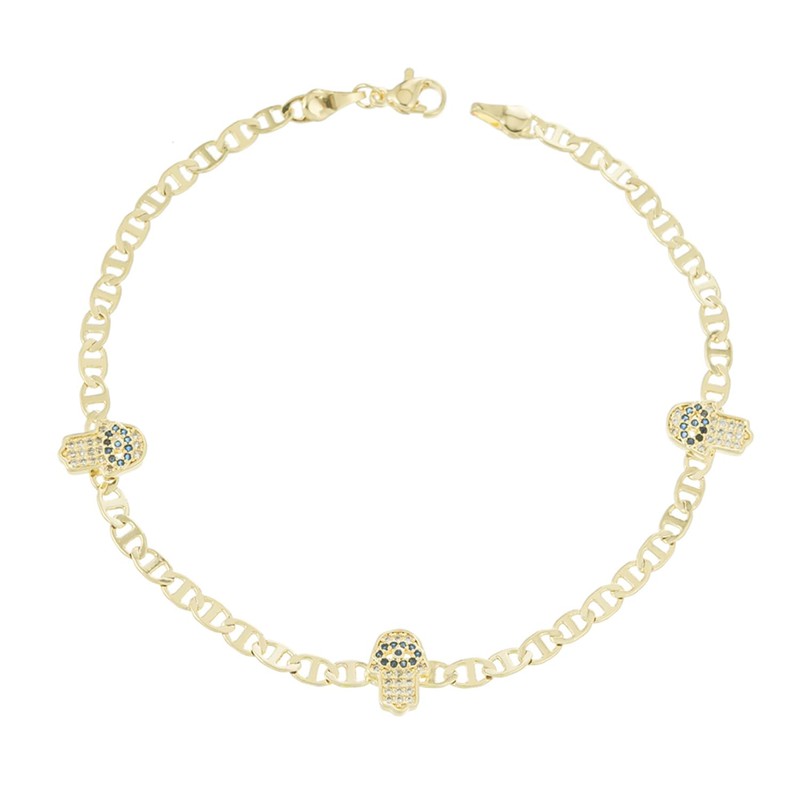 kelistom Evil Eye Anklet 14K White Gold Plated Ankle Bracelets for Women Zircon Inlay Evil Eye Hamsa Hand Charm Mariner Chain Anklets Waterproof 3-hand (Gold, 10 INCH)