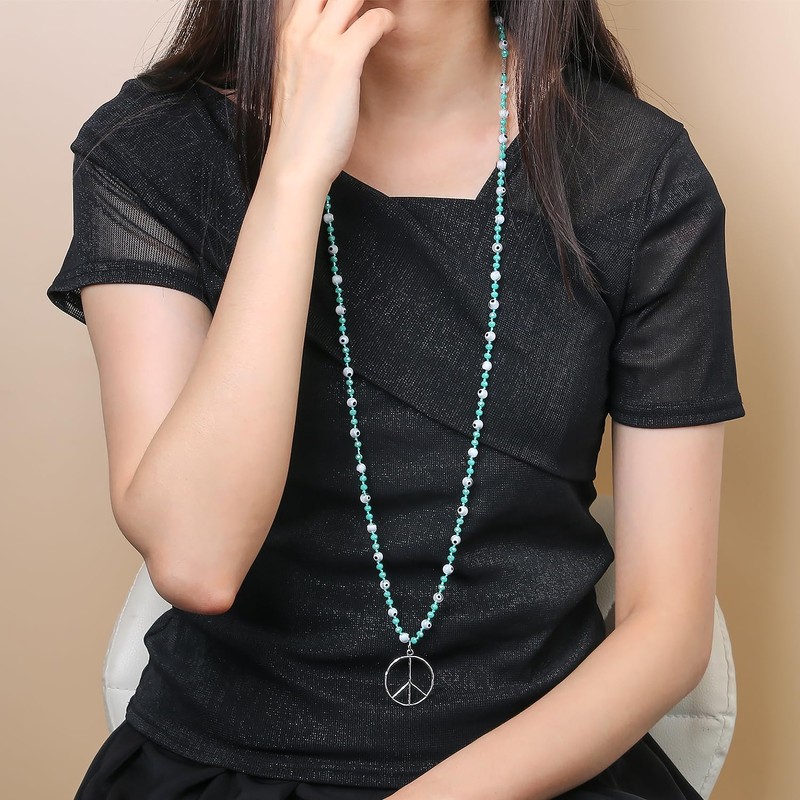 KELITCH Evil Eye Crystal Necklace for Women Peace Sign Pendant Necklace Long Beads Necklace, Nylon bead, Pearl